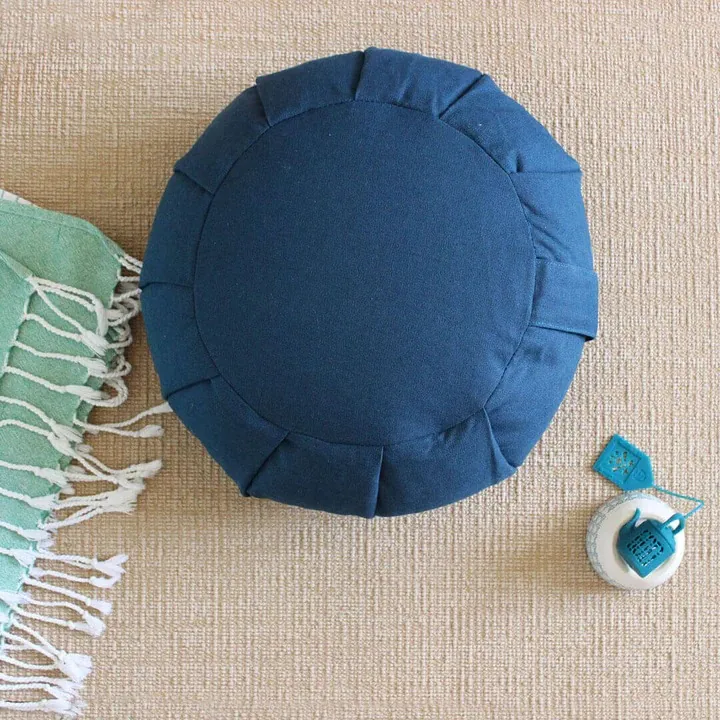 Cotton round meditation cushion with buckwheat filling.